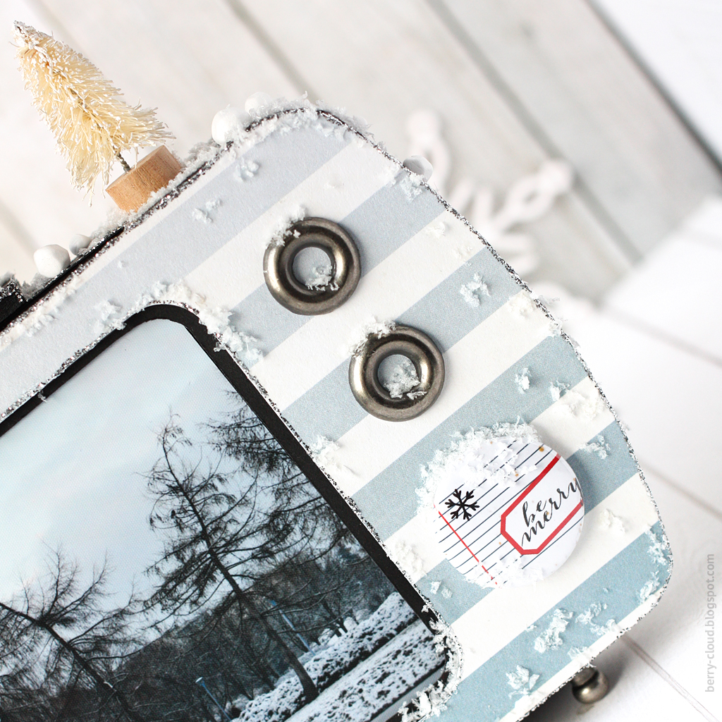 У меня сложилась зимняя рамка для фото в виде ретро-телевизора, или телевизора-приёмника, кому как нравится. Конструкция сделана с нуля, из переплетного картона, скрапбумаги, металлических украшений, проволоки, бусин, рождественской фишки, глиттера и еще нескольких подручных материалов.
